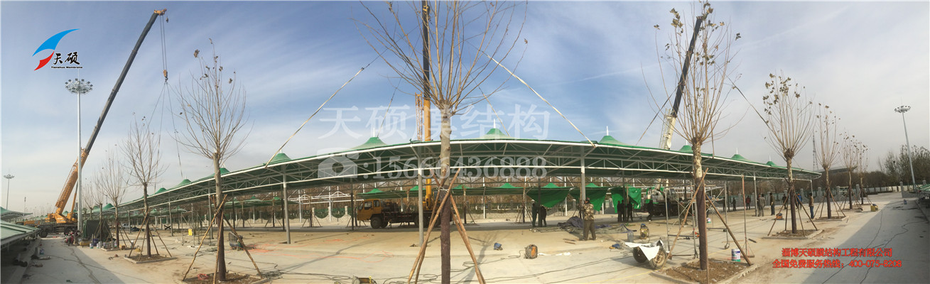為了更好的引導老商戶入住的積極性,承建方考察了各個地區的市場以后,引用了一種神奇的材料,讓市場不僅僅作為市場,更使其成為一道亮麗的風景線。市場采用新型膜結構材料,整體頂棚全部覆蓋PVDF建筑膜,膜材覆蓋面積達到一萬五千平米以上,采用新型、環保、抗老化、自潔性能極強的PVDF建筑膜材。承建本市場膜結構頂棚的山東天碩膜結構工程有限公司董事長說:“為了達到承建方要求,我們的設計團隊進行了半個月的深入考察,并且設計出了5套方案,經過和甲方多方協商,最后給大家呈現出了一個生機勃發的新型農貿市場”。