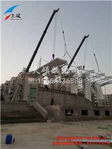 膜結構-鋼結構部分 整體提升安裝法是將待安裝的結構在地面或適宜的高度投影位置組裝成型,再利用地面靈活吊裝系統將成型結構整體向上提升至設計標高的一種安裝方法。當膜結構高度較高或現場條件不利于搭設腳手架時,膜結構-鋼結構整體提升的安裝法,可以起到安全、高效的作用。